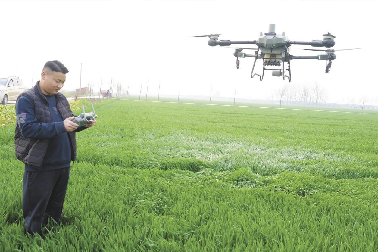 淮滨县大疆农业公司无人机飞手柴坤涛操作无人机,在固城乡的麦田里给小麦喷洒叶面肥。河南日报记者 王长江 摄
